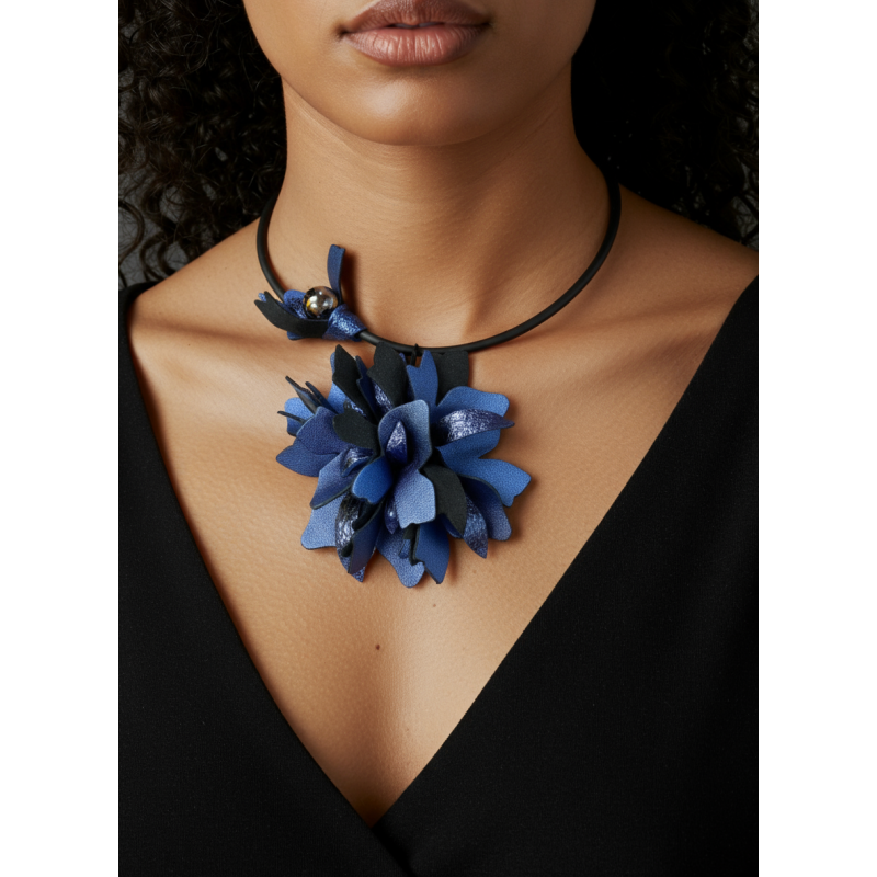 Entirely cut and assembled by hand of soft leather, this flower is mounted on a pliable rubber tour.