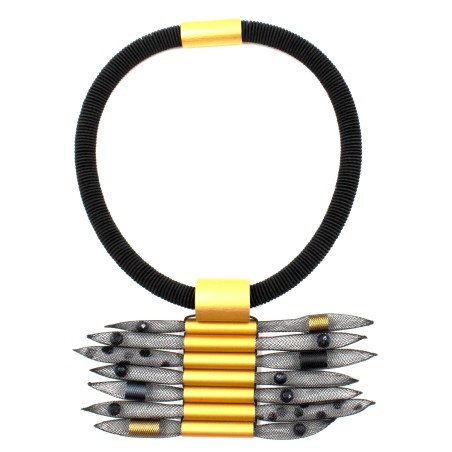 Feather-like mesh tubes mounted on a distinctive anodised aluminum sculpture, with rubber tour and magnetic closure.
