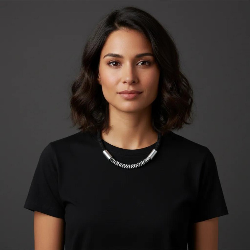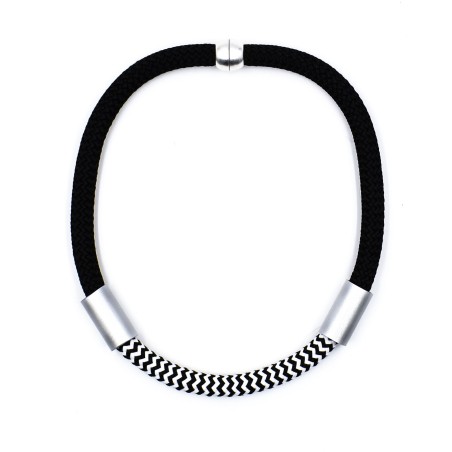 Necklace - checked cords w/ aluminum tubes & thick woven cord. Magnet closure
