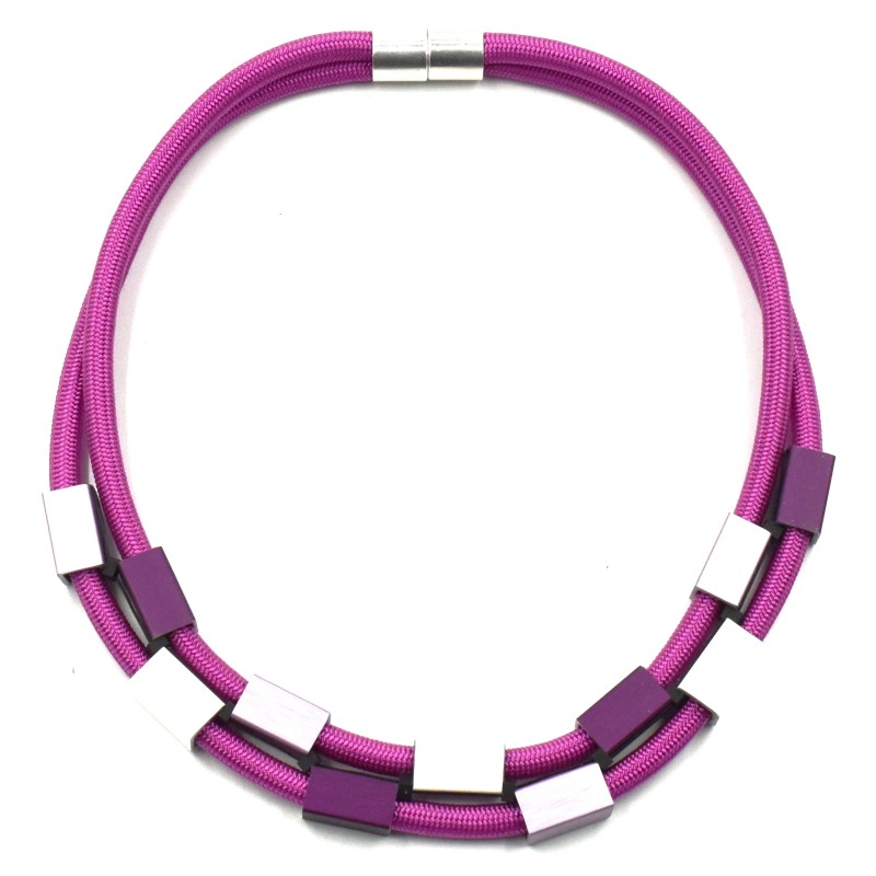 This striking 20" necklace features two thin cotton cords adorned with a generous row of staggered anodized‑aluminum cubes, creating a bold metallic statement in a compact, wearable design. The richly colored cubes catch the light beautifully, adding depth and drama without overwhelming your look. Finished with a secure magnetic closure, this modern piece delivers maximum impact in a sleek, minimalist silhouette.