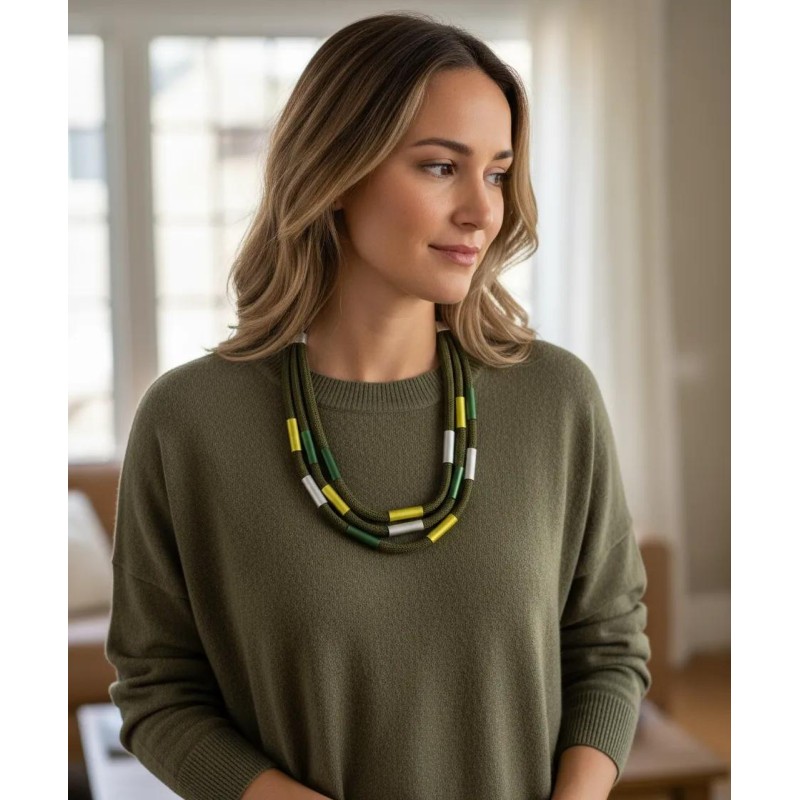 Triple necklace with adonized aluminum tubes on soft cotton cords.