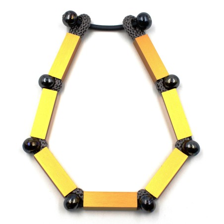 Hand-cut aluminum bars with ceramic pearl accents mounted on a rubber cord.