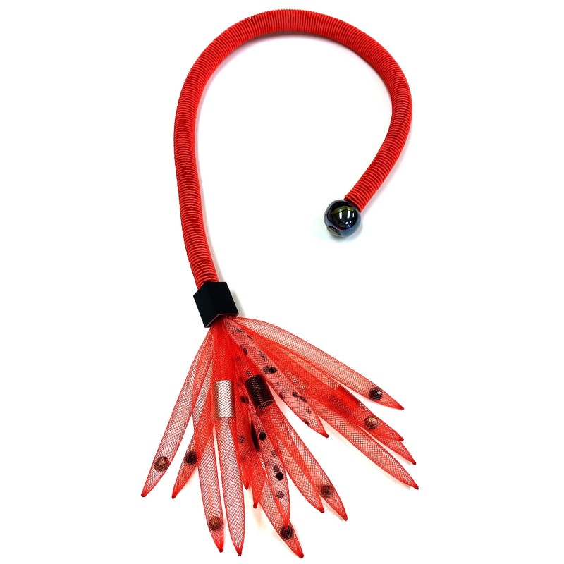 For those who love to be noticed in the very best way, this contemporary necklace delivers pure visual excitement. A flexible rubber tour, open in a sculptural S‑shape, creates the foundation. On one end sits a smooth ceramic ball, grounding the piece with minimalist elegance. On the other, an explosion of mesh “feathers” bursts outward like a small firework—light, airy, and full of movement.