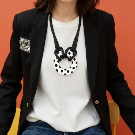 A playful yet refined design, this 24" necklace features a bold plexi donut paired with reversible resin circles, giving you two looks in one. The elements are strung on a thick woven cotton cord that adds texture, comfort, and a contemporary touch.