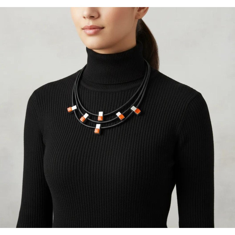 This innovative pairing of matte‑finished aluminum and luminous plexi results in a sculptural, architectural look that feels both artistic and wearable. Finished with a secure magnetic closure, this modern necklace adds effortless style and a distinctive creative flair to any outfit.