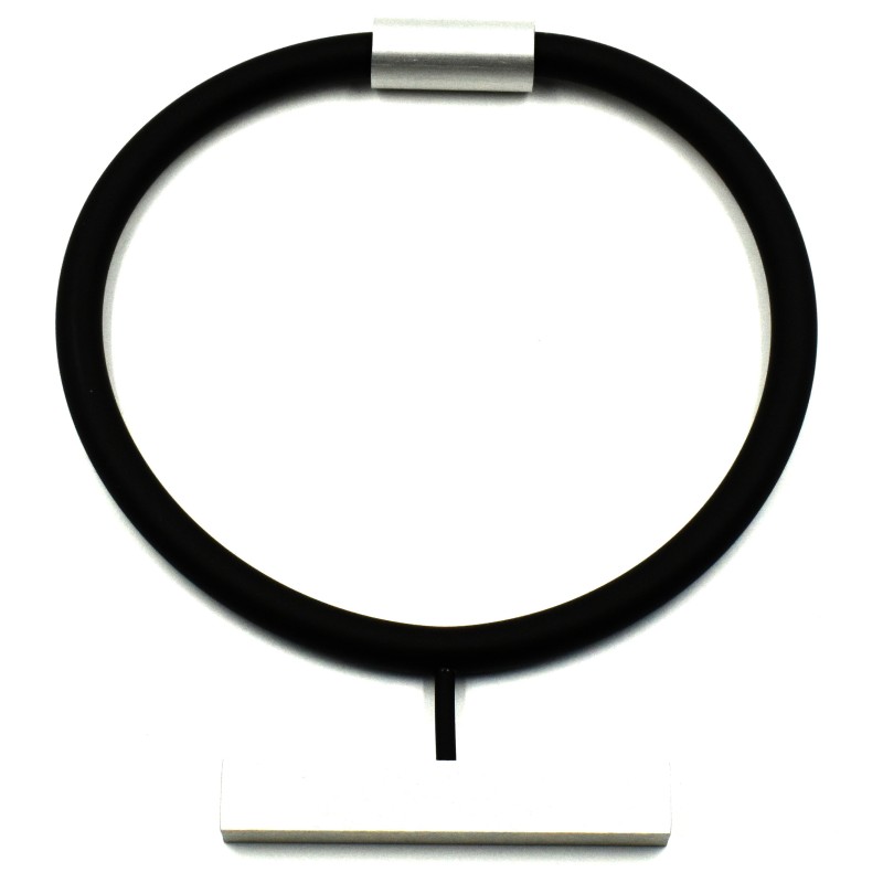 Embrace pure, modern minimalism with this striking necklace featuring a flexible rubber tour paired with a thick anodized‑aluminum bar mounted perpendicularly across the front. The clean, architectural line of the metal bar creates a bold, unembellished statement—nothing frilly, nothing girlie, just pure contemporary design at its finest.