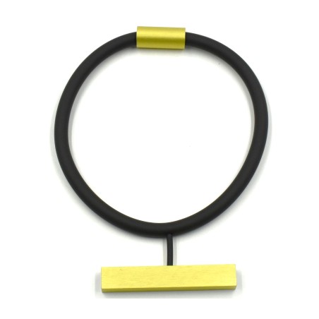Embrace pure, modern minimalism with this striking necklace featuring a flexible rubber tour paired with a thick anodized‑aluminum bar mounted perpendicularly across the front. The clean, architectural line of the metal bar creates a bold, unembellished statement—nothing frilly, nothing girlie, just pure contemporary design at its finest.