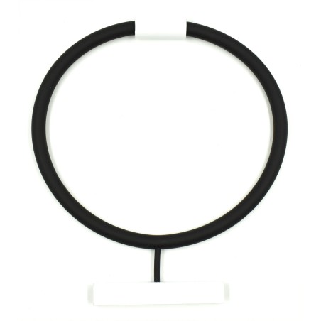 Embrace pure, modern minimalism with this striking necklace featuring a flexible rubber tour paired with a thick anodized‑aluminum bar mounted perpendicularly across the front. The clean, architectural line of the metal bar creates a bold, unembellished statement—nothing frilly, nothing girlie, just pure contemporary design at its finest.