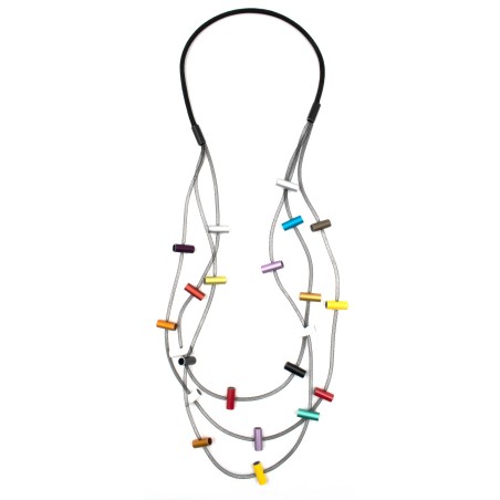 One of the most beloved designs Christina has ever created, this 24" necklace is crafted from long, airy mesh threads adorned with a cascade of anodized‑aluminum cylinders in glorious, luminous colors. The effect is fluid, playful, and unmistakably contemporary.