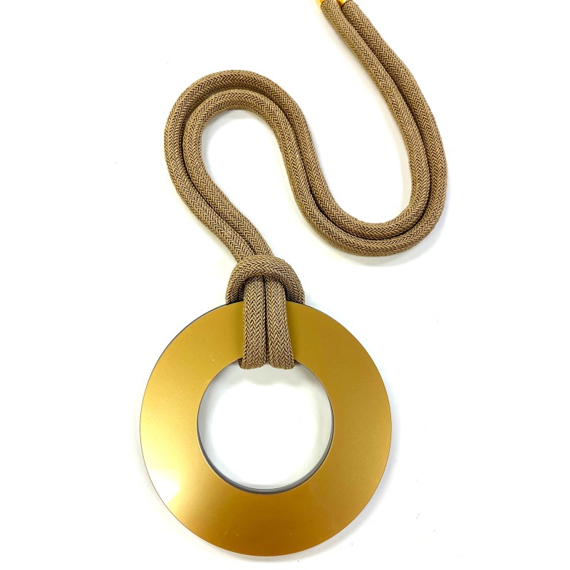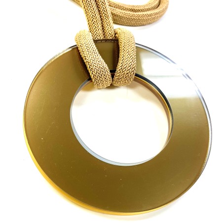30" necklace features a bold plexi donut paired with reversible resin circles, giving you two looks in one. The elements are strung on a thin woven cotton cord that adds texture, comfort, and a contemporary touch.
