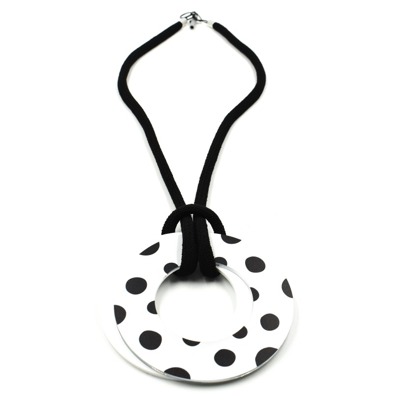 30" necklace features a bold plexi donut paired with reversible resin circles, giving you two looks in one. The elements are strung on a thin woven cotton cord that adds texture, comfort, and a contemporary touch.