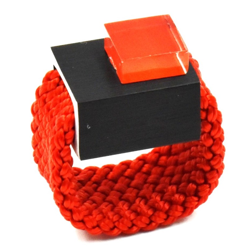 New and fabulous!! A ring collection made of comfortable fabric with an anodized aluminum cube topped with a plexi window.