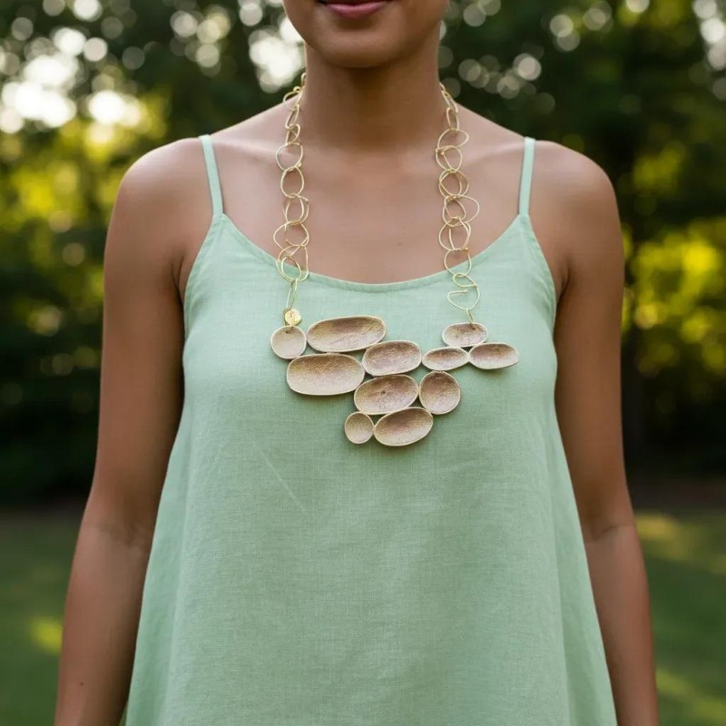 A necklace with a 3" tall x 5 1/2" wide cluster of eleven mixed bronze round and horizontal elongated ovals, hand-painted with special pigments.