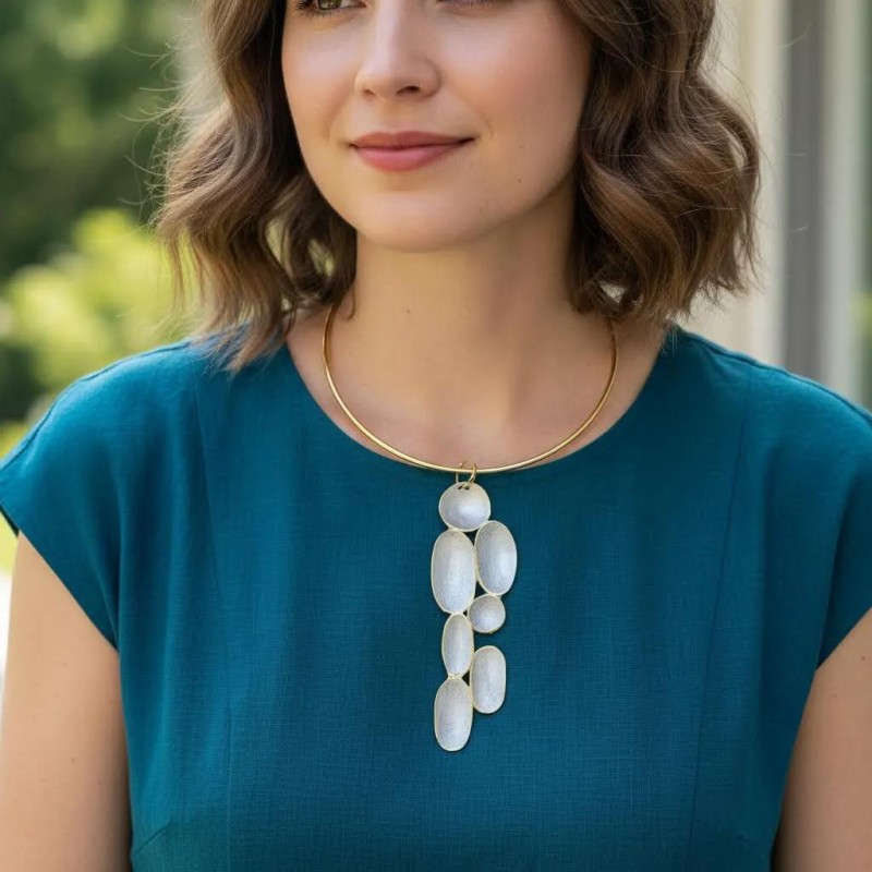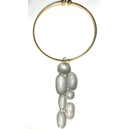 A torc with a 5" tall x 1 1/2" wide mixed cluster of five bronze vertical elongated ovals and two circles, hand-painted with special pigment. Thin gold torc.