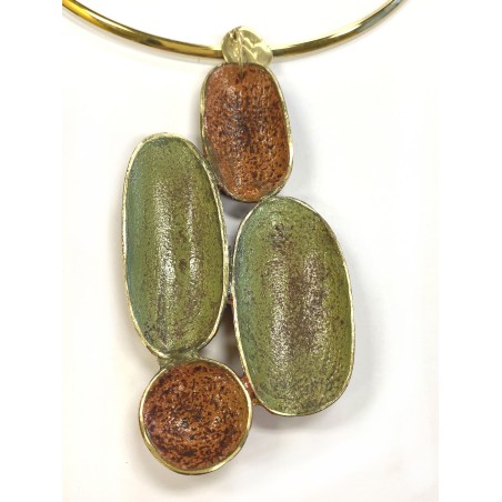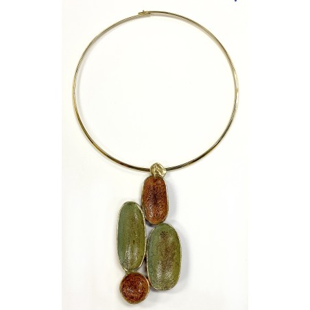 A torc with a 4" tall x 2" wide cluster of three bronze vertical elongated ovals and one circle, hand-painted with special pigment. Medium gold torc.