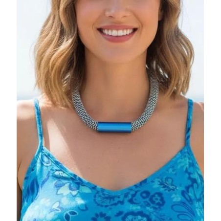 20" necklace with a slick elastic cord and a hidden magnetic clasp inside the aluminum cylinder.