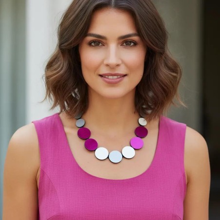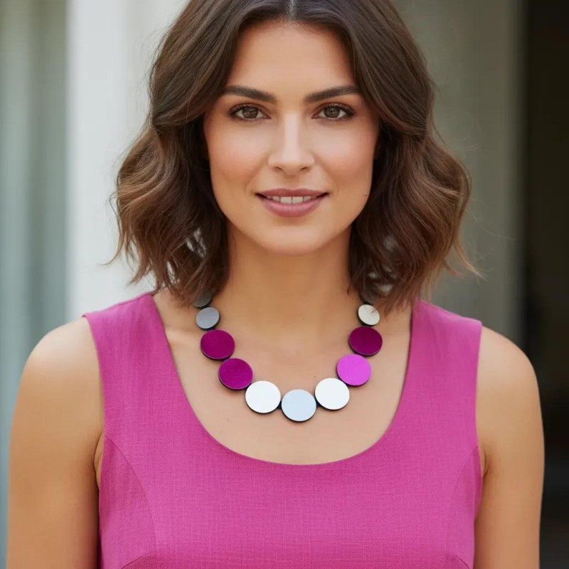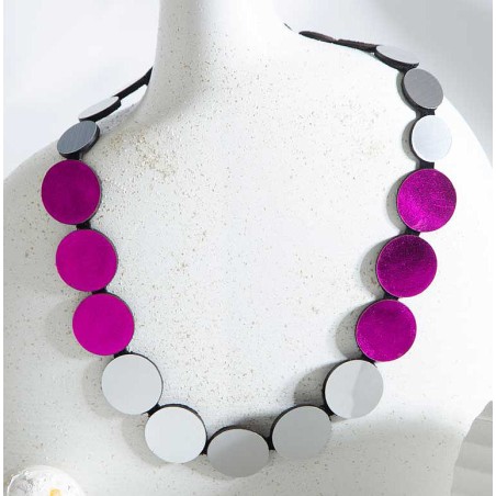 A well-balanced mix of acrylic and leather coins for a quiet elegance.