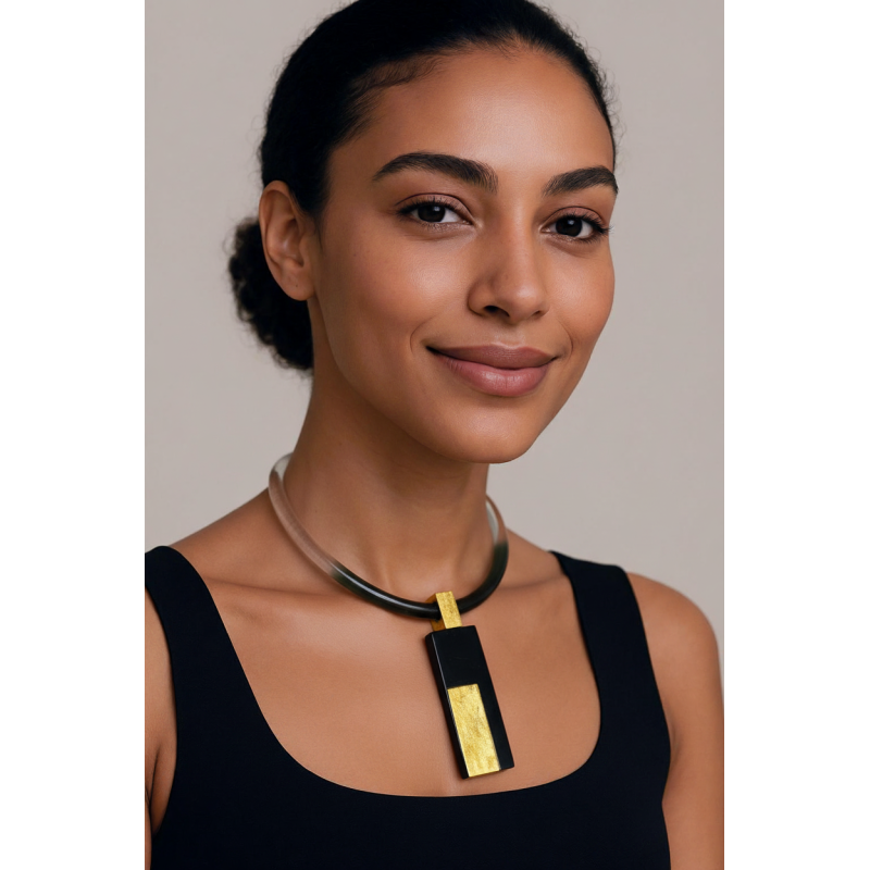 A contemporary pendant made of Lucite a "window" of clear Lucite inlaid with a gold foil with special effects.