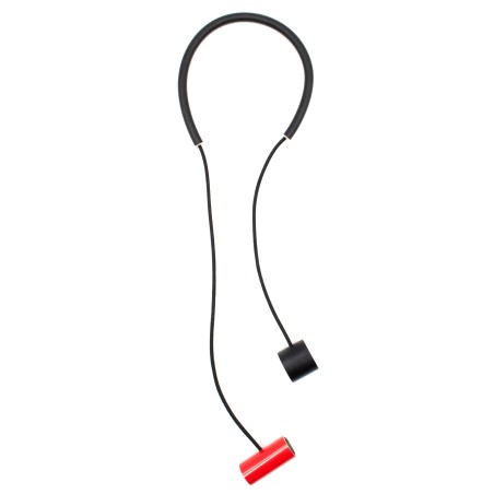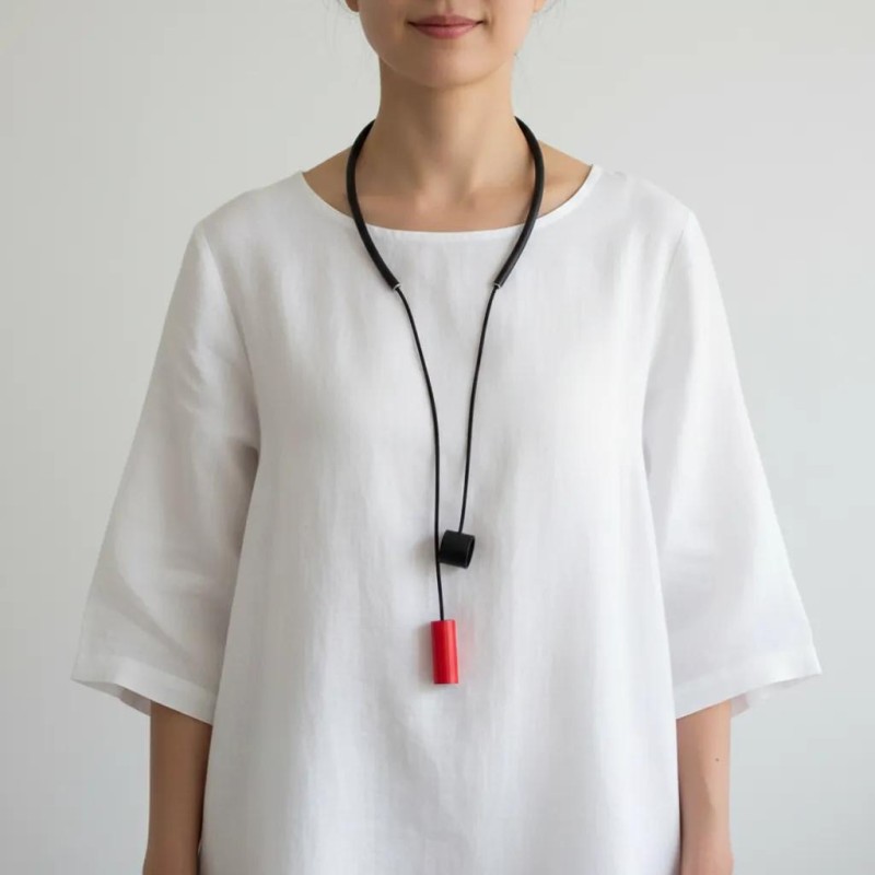 Long necklace with 2 large aluminum cylinders you can wear nestled inside each other, with flexible rubber tour for absolute comfort.