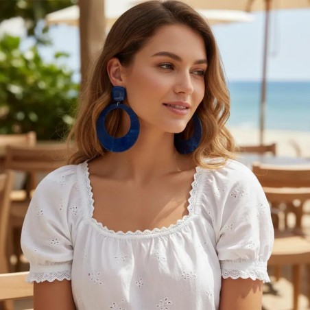 The same exquisite Italian acrylic—deep navy with a gorgeous, refined surface—now reimagined in the shape of a large, graceful hoop. Light, flattering, and endlessly versatile, this design brings a touch of modern chic to a timeless classic.