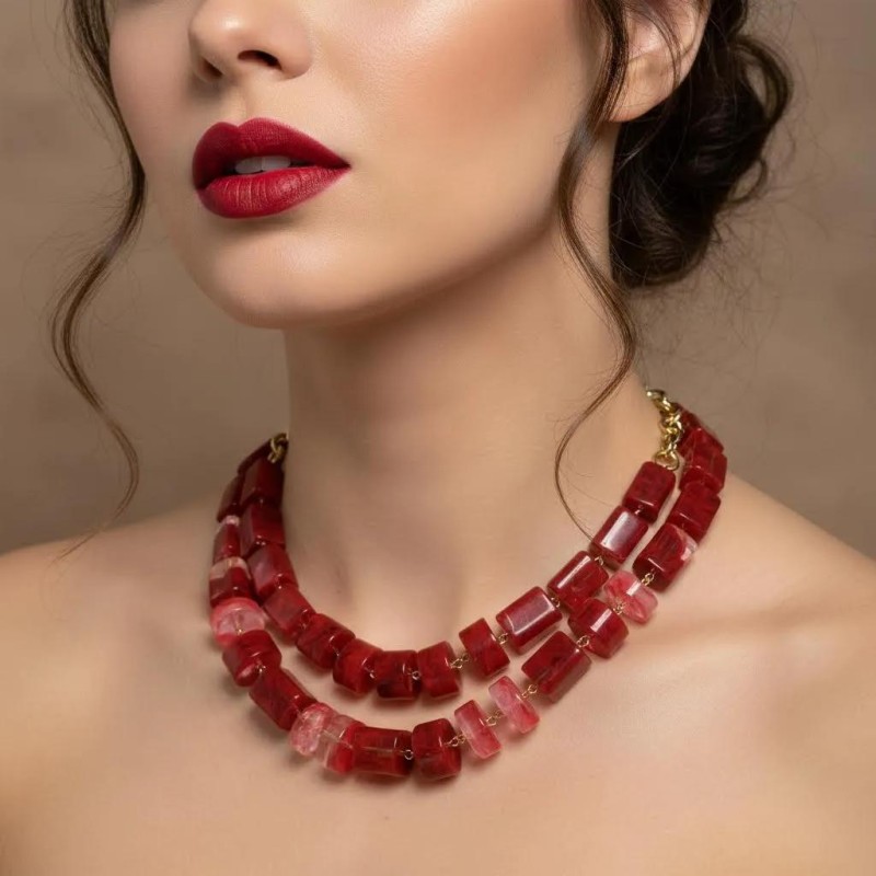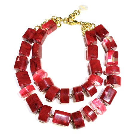 This piece once again puts the material at the forefront. Made from top‑tier Italian Lucite, it features two rows of beads that are transparent in some areas and infused with color inclusions in others, creating a beautiful play of light throughout the necklace.