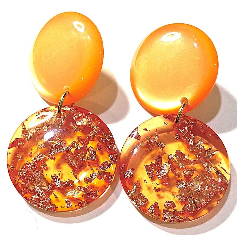 An extremely well-balanced clip earrings made with translucent Polaris on top and a transparent acrylic coin with silver foil inclusion.