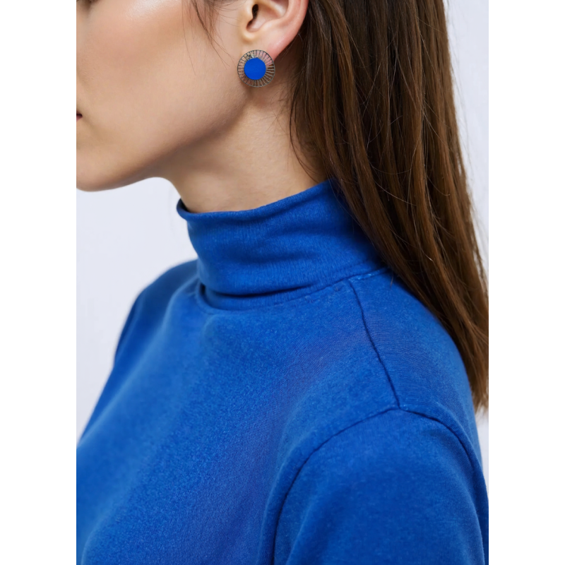 Bronze post earrings, 1" dia., galvanized with rhodium and plated in hematite, with blue pigment core.