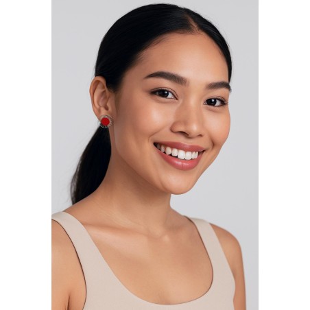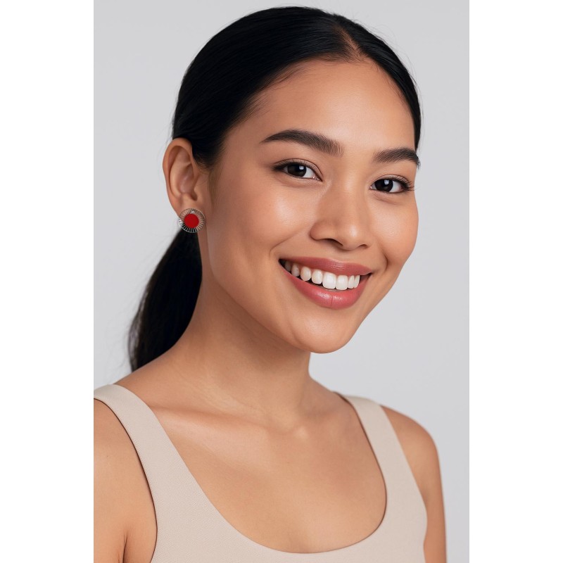 Bronze post earrings, 1" dia., galvanized with rhodium and plated in hematite, with red pigment core.