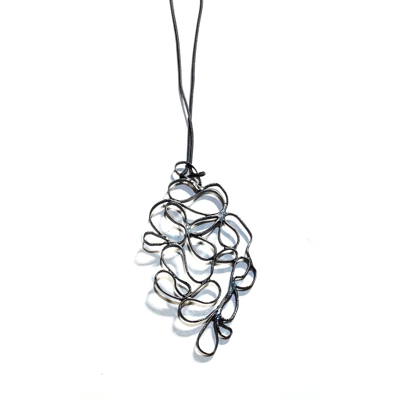 Bronze pendant, galvanized with rhodium and plated in HEMATITE. On 32" long cord.