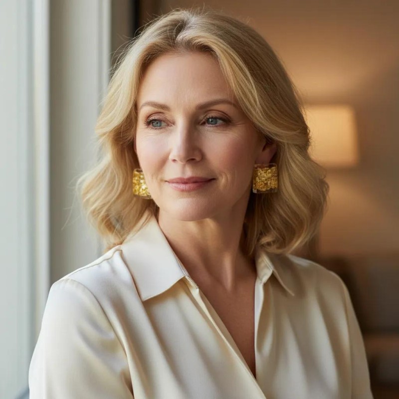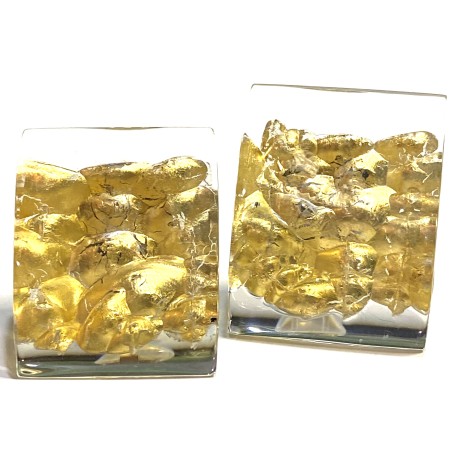 An exceptional clip earrings with transparent Lucite inlaid with a ckrickled gold foil for special effect