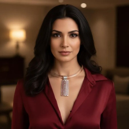 Clear Lucite tour with a dramatic pendant with silver foil and red cubic zirconia