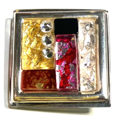 Each piece is crafted from Lucite segments, meticulously designed by Laurent with colored lacquer, gold or silver foil inclusions, and expertly assembled as mosaics within pewter shapes.