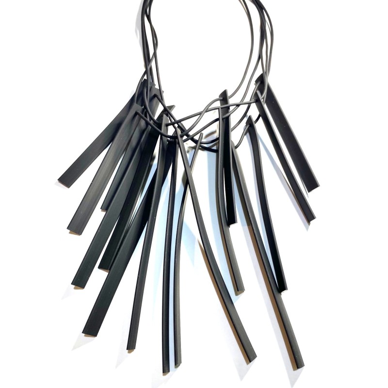 18" multi-strand soft rubber cord with magnetic closure, anchoring a waterfall of hand-cut translucent rubber strips in various sizes.