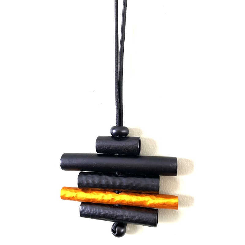 Each tube begins as a simple sheet of aluminum, transformed through hand‑hammering into a textured surface that catches the light with subtle movement. Thick, saturated pigments are applied in bold, expressive colors, turning every piece into a vibrant stroke of wearable art. The metal is then shaped seamlessly into a smooth, continuous tube—no joins, no edges, just pure sculptural form.
