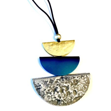 Their layered arcs create a play of light and shadow, giving the pendant a sense of movement even at rest. Suspended from a smooth, adjustable cord that shifts effortlessly from 20" to 30", the piece adapts to your style and silhouette.