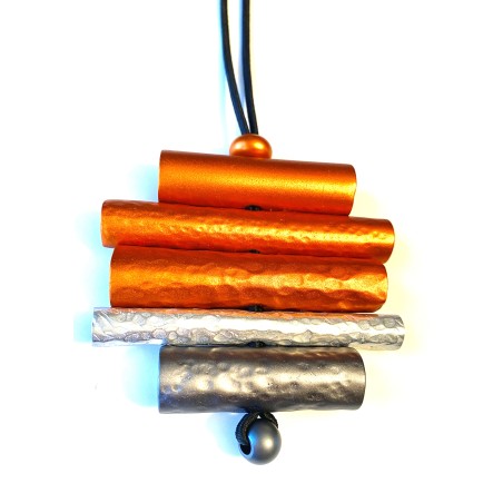 Each tube begins as a simple sheet of aluminum, transformed through hand‑hammering into a textured surface that catches the light with subtle movement. Thick, saturated pigments are applied in bold, expressive colors, turning every piece into a vibrant stroke of wearable art. The metal is then shaped seamlessly into a smooth, continuous tube—no joins, no edges, just pure sculptural form.