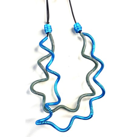 This striking necklace is crafted from a single ribbon of lightweight aluminum, expertly spiraled to hold its graceful, undulating shape. Each piece is anodized in a rich, saturated tone, then infused with a second layer of pigment to amplify the color with an electrifying depth. Thanks to Monica’s signature adjustable system, the necklace can be easily shaped for a perfect, personalized fit.