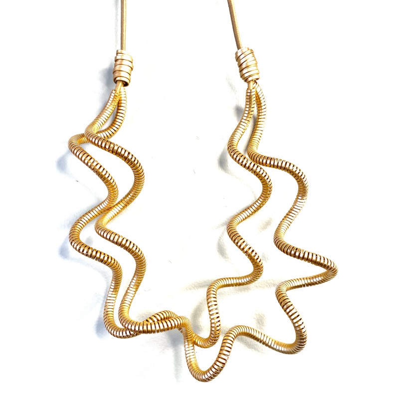 This striking necklace is crafted from a single ribbon of lightweight aluminum, expertly spiraled to hold its graceful, undulating shape. Each piece is anodized in a rich, saturated tone, then infused with a second layer of pigment to amplify the color with an electrifying depth. Thanks to Monica’s signature adjustable system, the necklace can be easily shaped for a perfect, personalized fit.