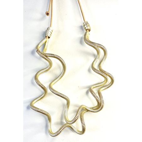 This striking necklace is crafted from a single ribbon of lightweight aluminum, expertly spiraled to hold its graceful, undulating shape. Each piece is anodized in a rich, saturated tone, then infused with a second layer of pigment to amplify the color with an electrifying depth. Thanks to Monica’s signature adjustable system, the necklace can be easily shaped for a perfect, personalized fit.