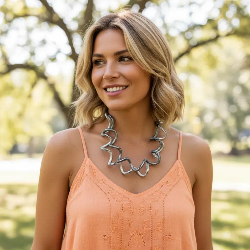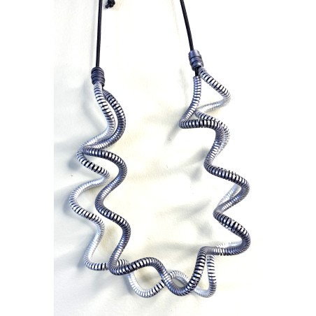 This striking necklace is crafted from a single ribbon of lightweight aluminum, expertly spiraled to hold its graceful, undulating shape. Each piece is anodized in a rich, saturated tone, then infused with a second layer of pigment to amplify the color with an electrifying depth. Thanks to Monica’s signature adjustable system, the necklace can be easily shaped for a perfect, personalized fit.