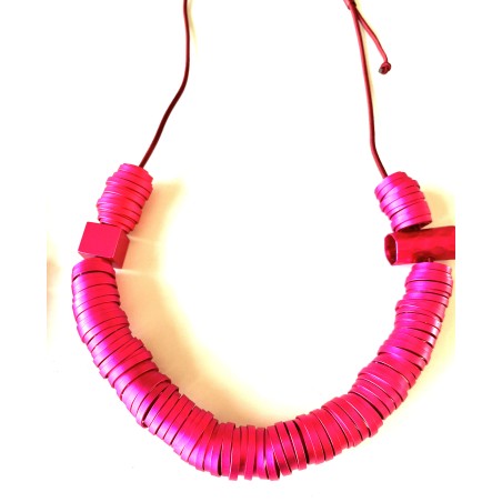 This piece stands among Monica’s most industrial‑inspired designs, built from a long, thick‑cut aluminum ribbon that twists like a spring around an adjustable cord. Its bold, architectural coil is accompanied by two contrasting elements: a seamless tube with subtle texture on one side, and a small, smooth‑surfaced cube on the other. The interplay of forms—spiral, tube, cube—creates a striking balance of movement and precision.