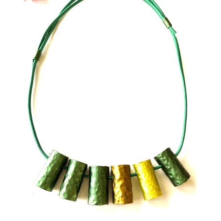 Each tube begins as a simple sheet of aluminum, transformed through meticulous hand‑hammering into a textured surface that catches the light with subtle, shifting movement. Bold, saturated pigments are applied in thick layers, creating expressive colors that turn every tube into a vibrant stroke of wearable art. The metal is then shaped into a perfectly smooth, continuous form—no seams, no edges, just pure sculptural clarity.