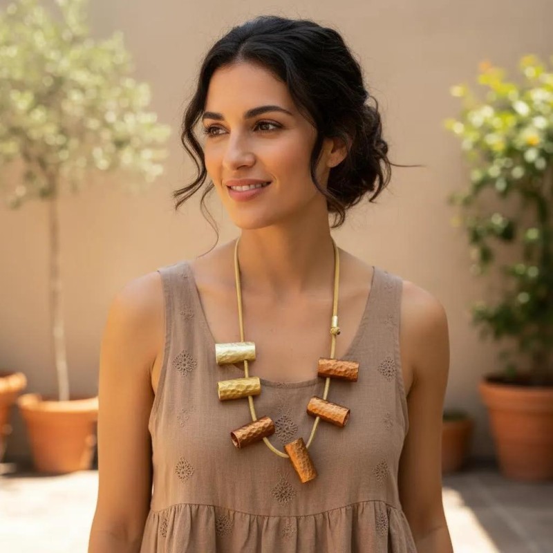 Each tube begins as a simple sheet of aluminum, transformed through meticulous hand‑hammering into a textured surface that catches the light with subtle, shifting movement. Bold, saturated pigments are applied in thick layers, creating expressive colors that turn every tube into a vibrant stroke of wearable art. The metal is then shaped into a perfectly smooth, continuous form—no seams, no edges, just pure sculptural clarity.