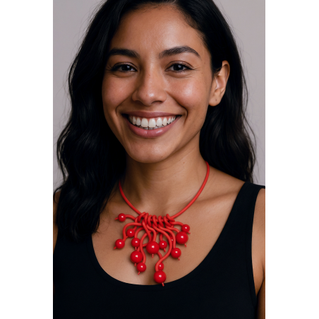 18" necklace w/ twisted & curled rubber sticks w/ glass balls, rubber cord & adjustable closure.