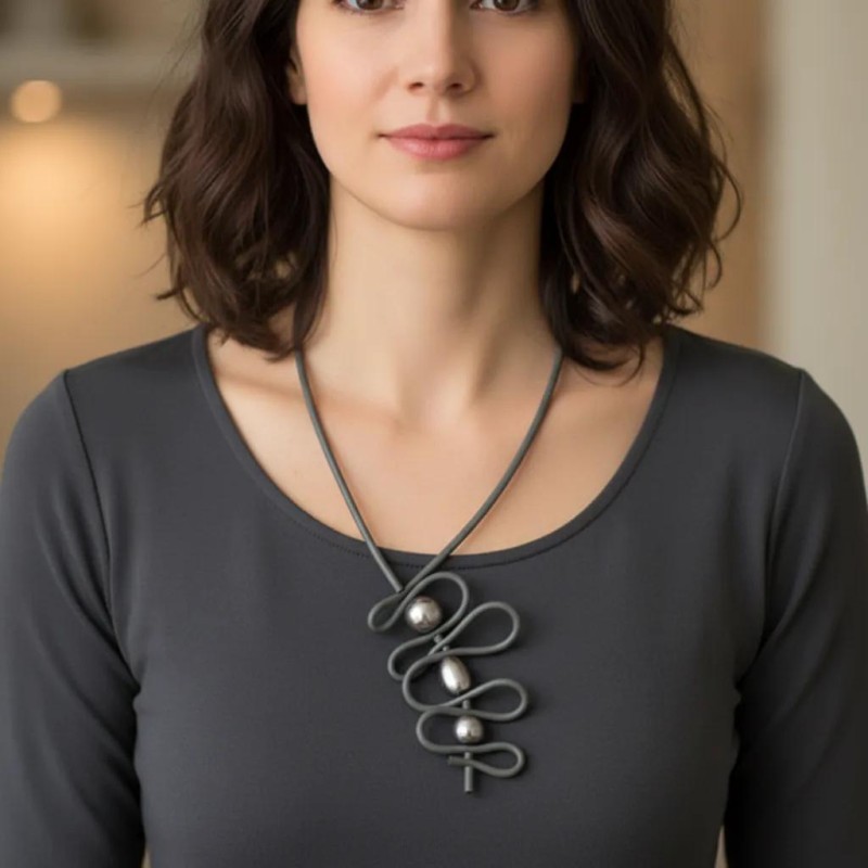 18" necklace w/ looped rubber cord, Egyptian (metal) pearls & an adjustable closure.