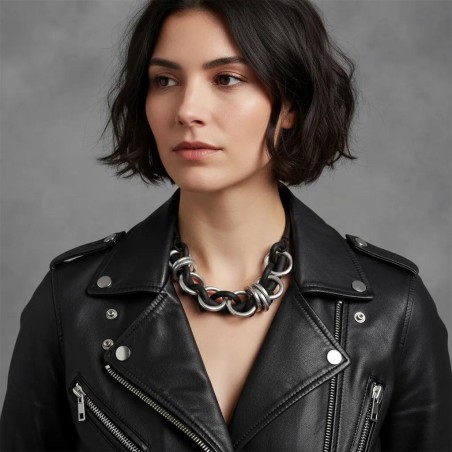 18" necklace - chunky rubber cord woven through metal rings, adjustable closure.