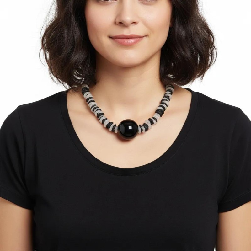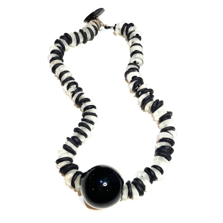 18" necklace w/ graphic rubber/Murano glass pendant.  Slim rubber cord w/ adjustable closure.