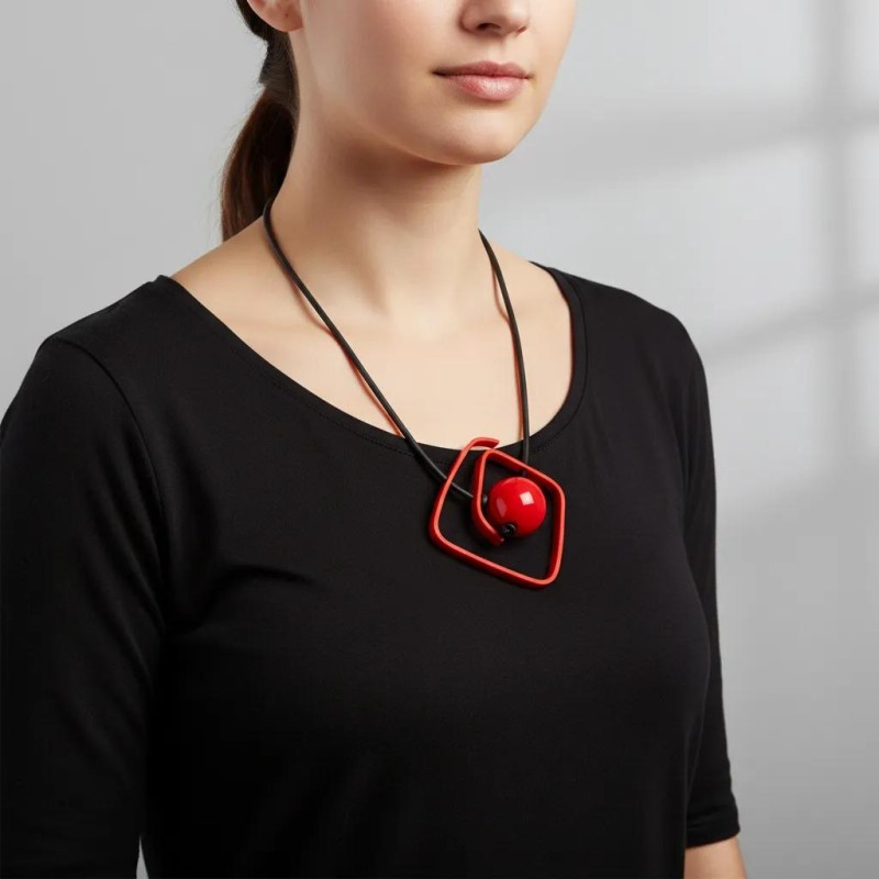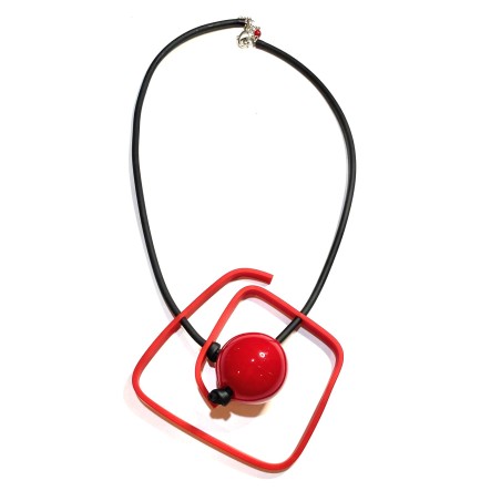 Labyrinth pendant of flat rubber ribbon & Murano glass ball. Slim rubber cord w/ adjustable closure.
