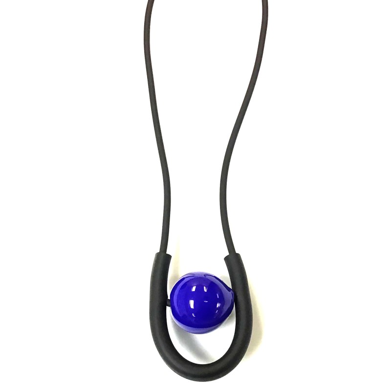 18" necklace w/ graphic rubber/Murano glass pendant. Slim rubber cord w/ adjustable closure.