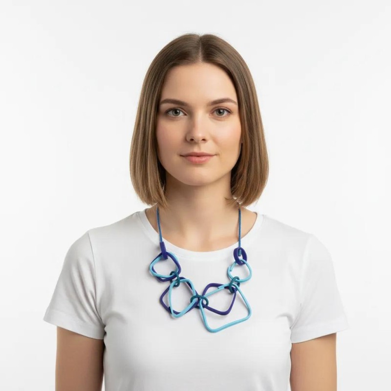 22" necklace of interlocking squares of 1/4" flat rubber ribbons, hanging from a metal mesh Mokuba cord.